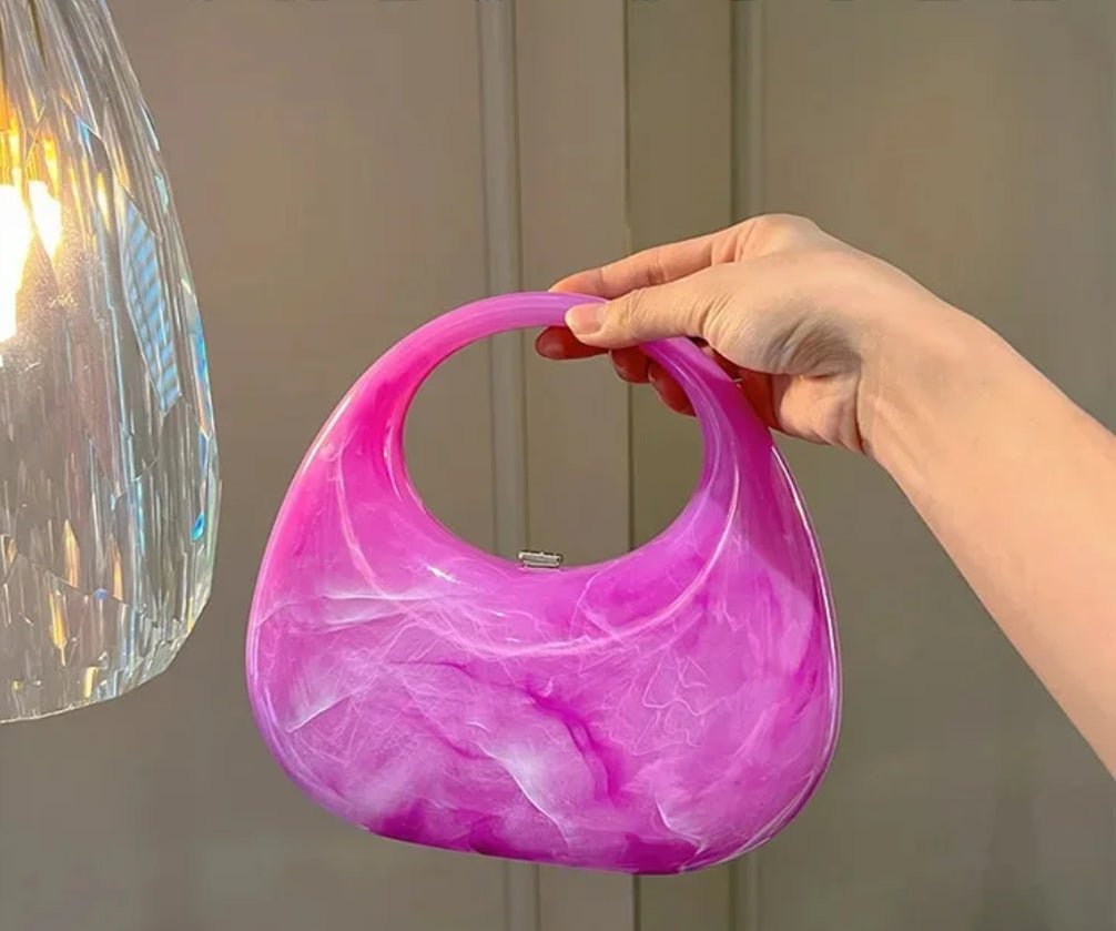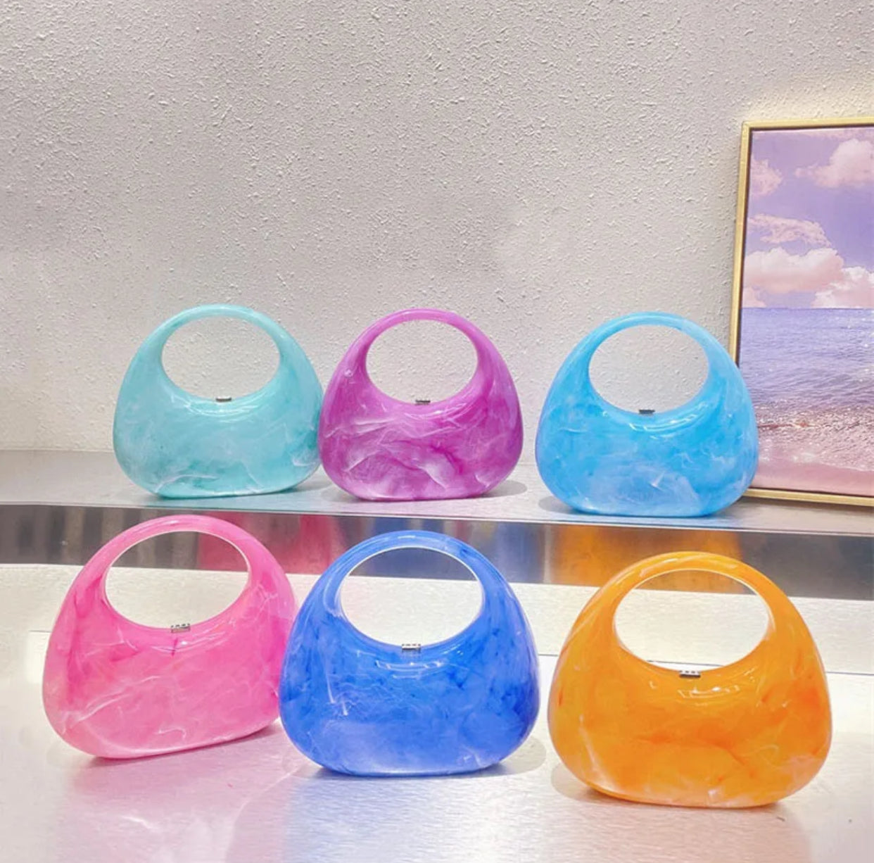 Elevate your vacation style with our Santorini Mini. Crafted from high-quality acrylic with a marble effect, this compact yet stylish accessory is perfect for carrying your essentials in a trendy way.